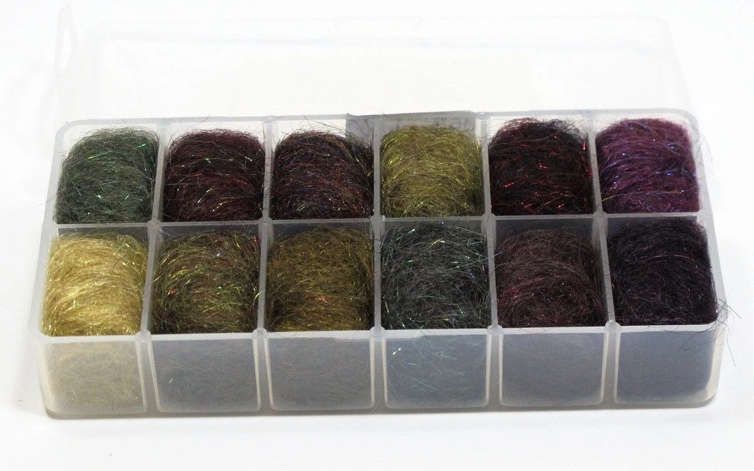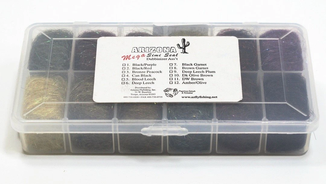 Arizona Mega Simi Seal Dubbinizer #1 is a a collection of twelve colors of this popular dubbing. Mega Simi Seal Dubbing has long fibers which are great for heads on streamers, dubbing loops, and buggy nymphs!