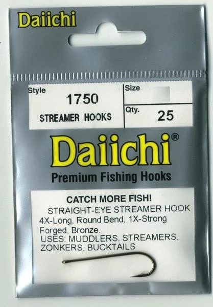 Daiichi 1750 Streamer Hook 25 Pack. Straight Eye, 4x-Long, Round Bend, 1x-strong. Forged Bronze. Uses Muddlers, Streamers, Zonkers, Bucktails.