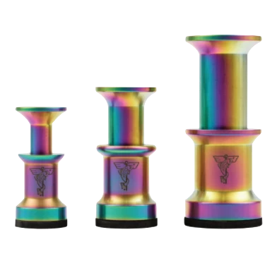 Titanium Nitride coating creates a harder surface for smooth action. Each stacker has unique and fantastic swirls of blue, red, green, and orange. Neoprene padded base.