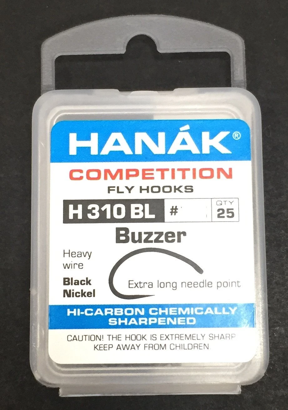 Hanak H 310 BL Buzzer Hook 25 Pack. Great for buzzers, scuds, czech nymphs, and emergers patterns. Black Nickel finish, with an extra long needle point. High Carbon Steel and Chemically Sharpened. Medium Wire. H310BL