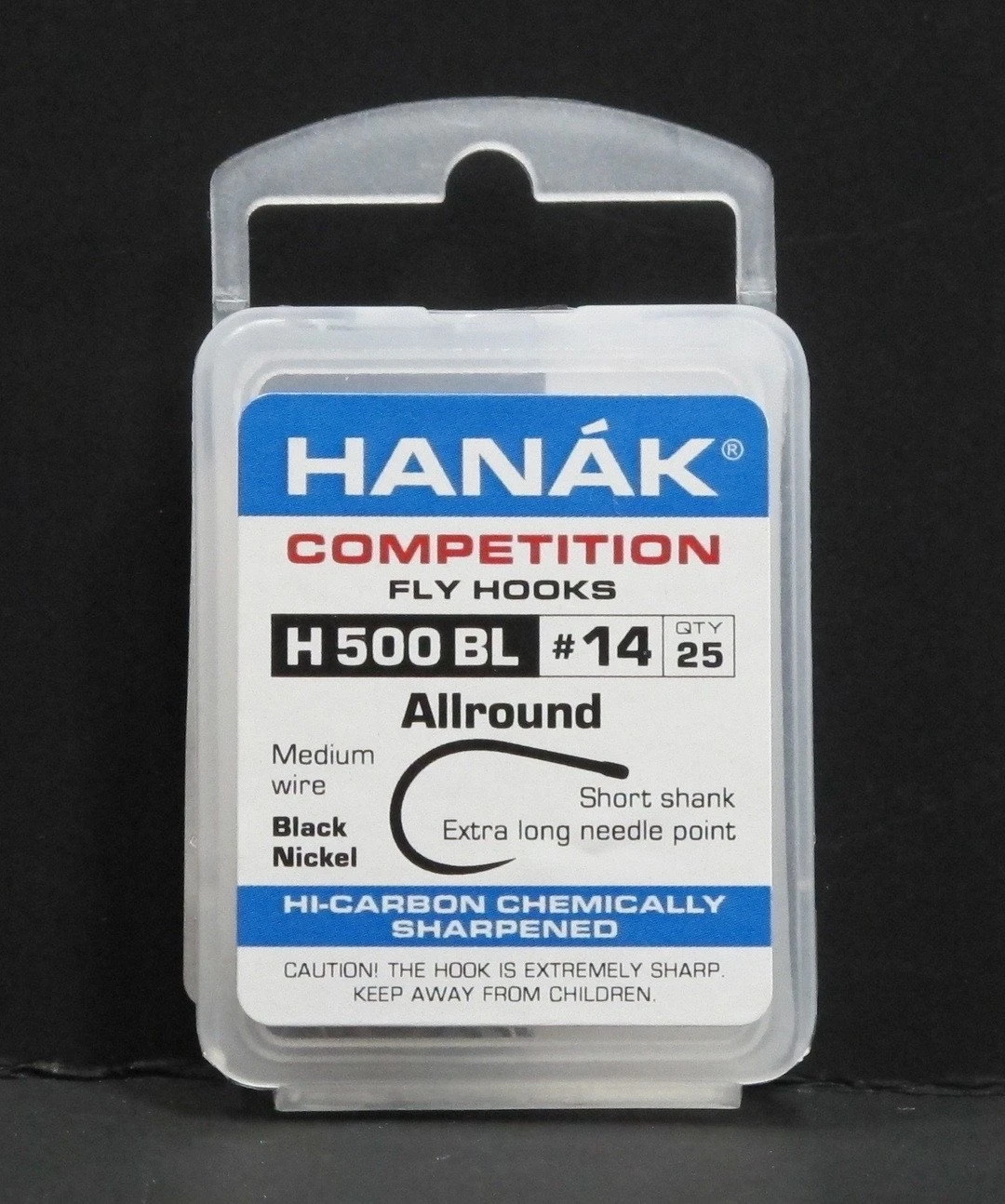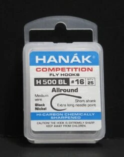 Hanak H 500 BL All Around Hook 25 Pack. Great for small nymph patterns, wet flies, and emerger patterns. Black Nickel finish, with an extra long needle point. High Carbon Steel and Chemically Sharpened. Medium Wire. H500BL