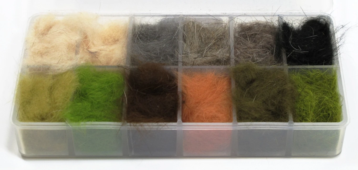 The 12 most popular colors of Hareline Dubbin rabbit dubbing are included in this dubbing dispenser. Natural Rabbit fur dubbing is great for nymphs and even dry flies. Very easy to dub.