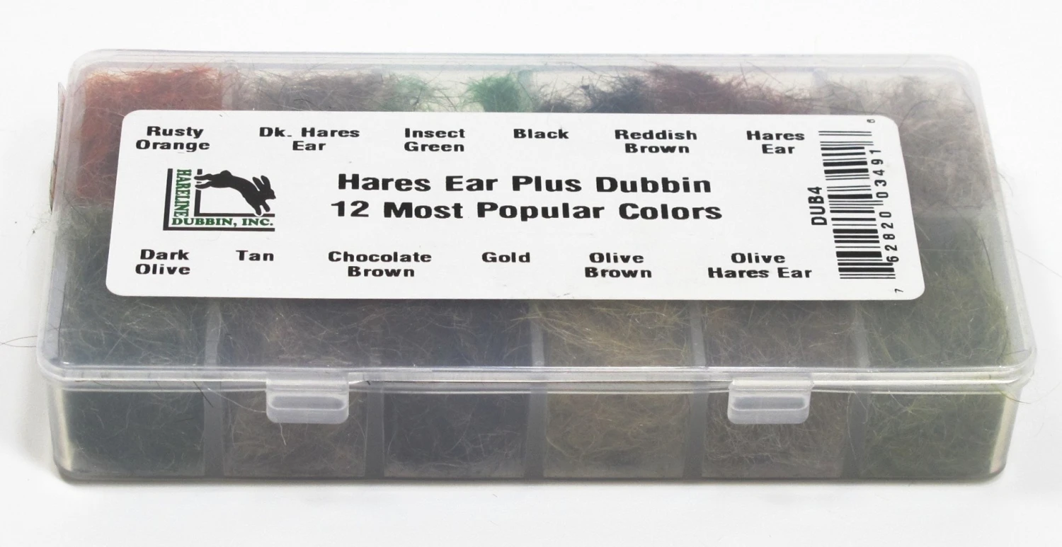 Hareline Hare’s Ear Plus Dub Dispenser – This 12 compartment dispenser hold the 12 colors of the Hare’s Ear Plus Dubbing. Hare’s ear plus is a mix of rabbit guard hairs and antron for a perfect mix of spiky with a little sparkle.