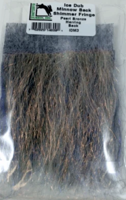 Hareline Dubbin’s Ice Dub Minnow Back Shimmer Fringe. This new material will make creating baitfish patterns very easy. Here’s what Hareline has to say about Ice Dub Minnow Back Shimmer Fringe- Unique color mixes from light to dark will add life an mobility to your minnow patterns. We fused the ends of our ice dub fibers which allows the complete ease of use for winging and fly bodies. Trim a piece off, tie in, and some eyes, hit it with some clear cure goo an fish!
