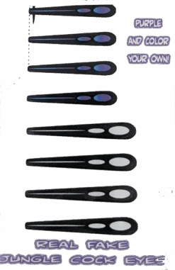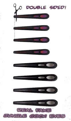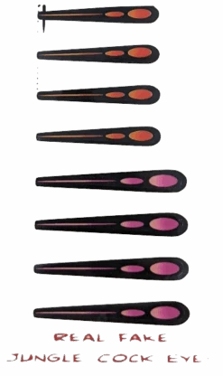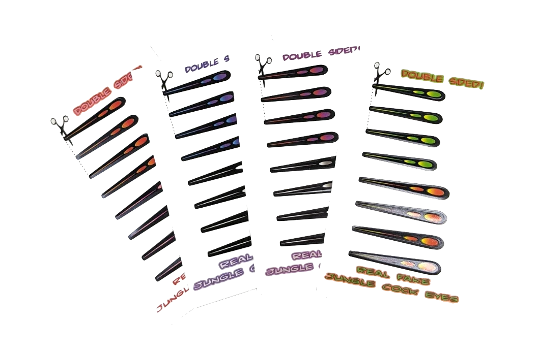 Real Fake Jungle Cock Eyes. Fun substitute for the expensive and hard to find real jungle cock feathers. Add color and class to your salmon and steelhead flies. Real fake jungle cock eyes look great on feather gamechanger flies.
