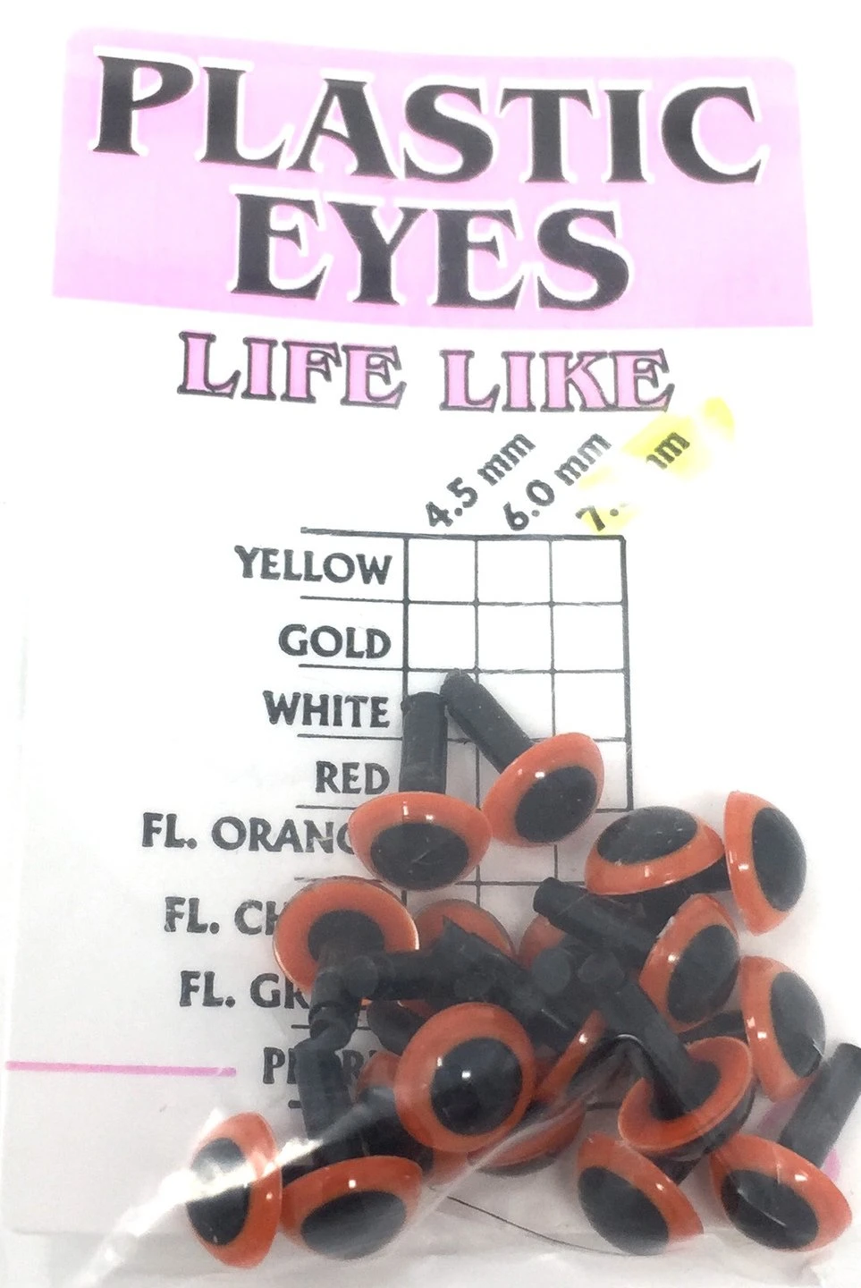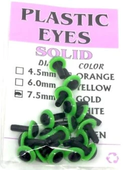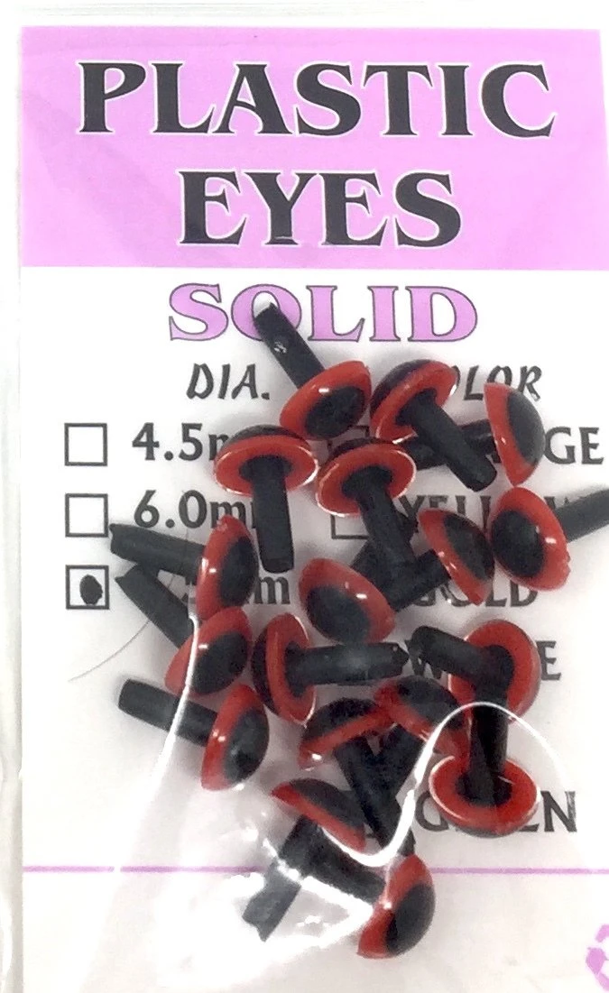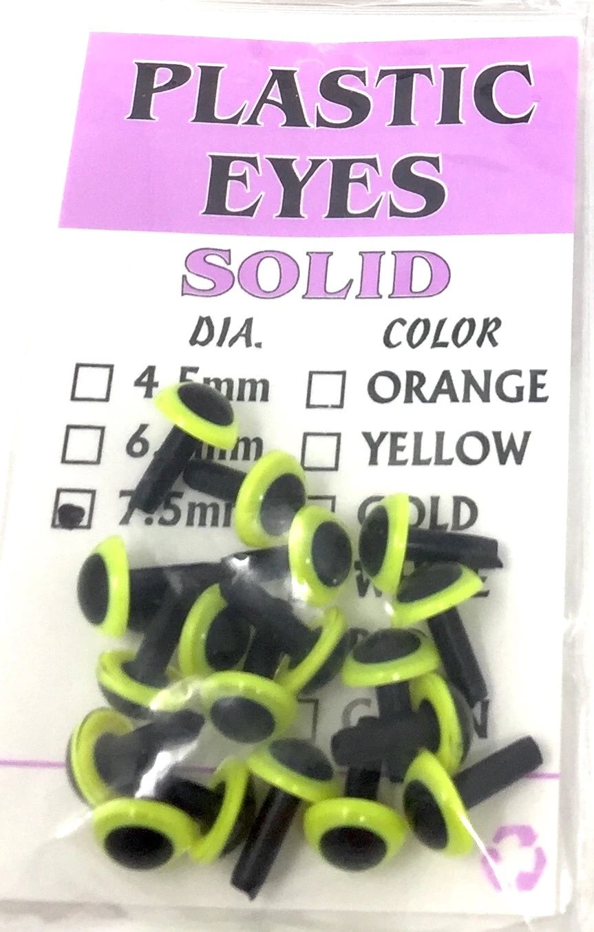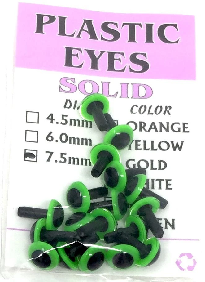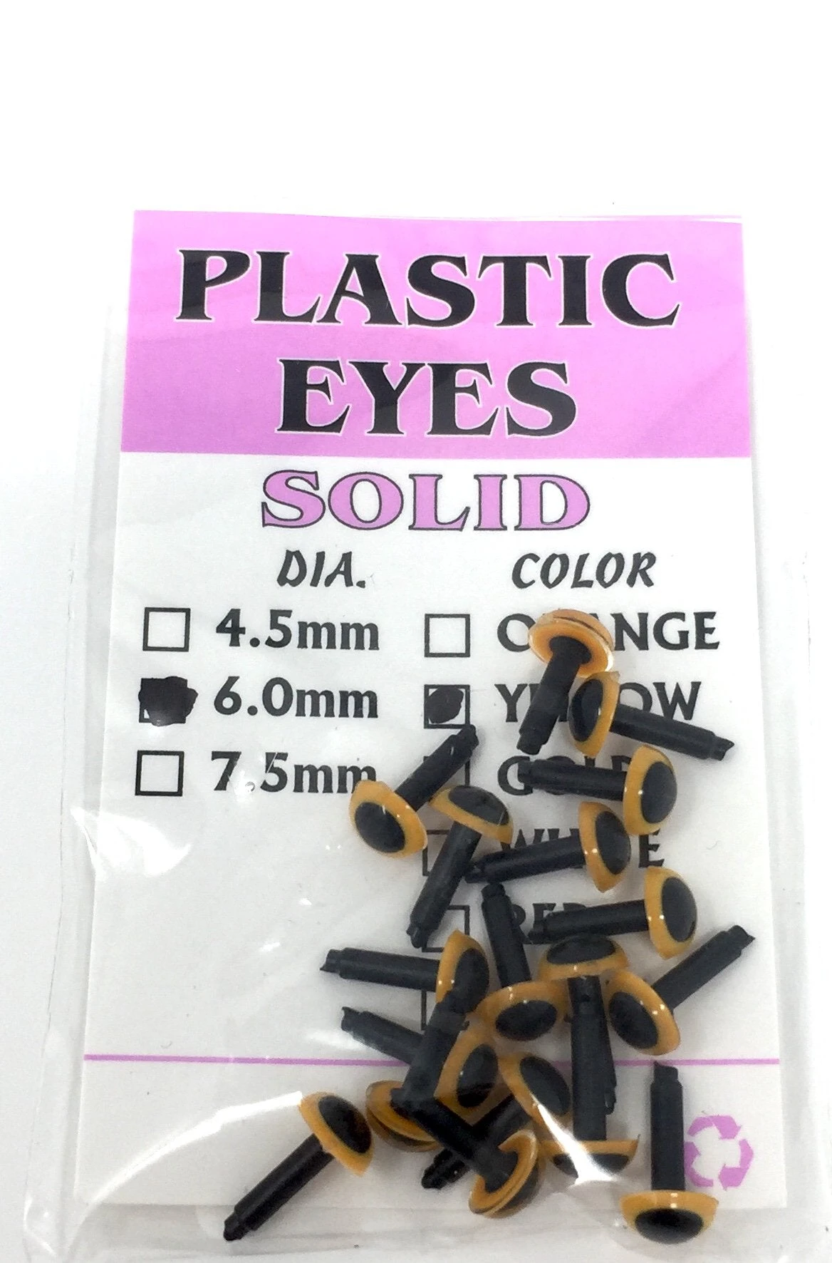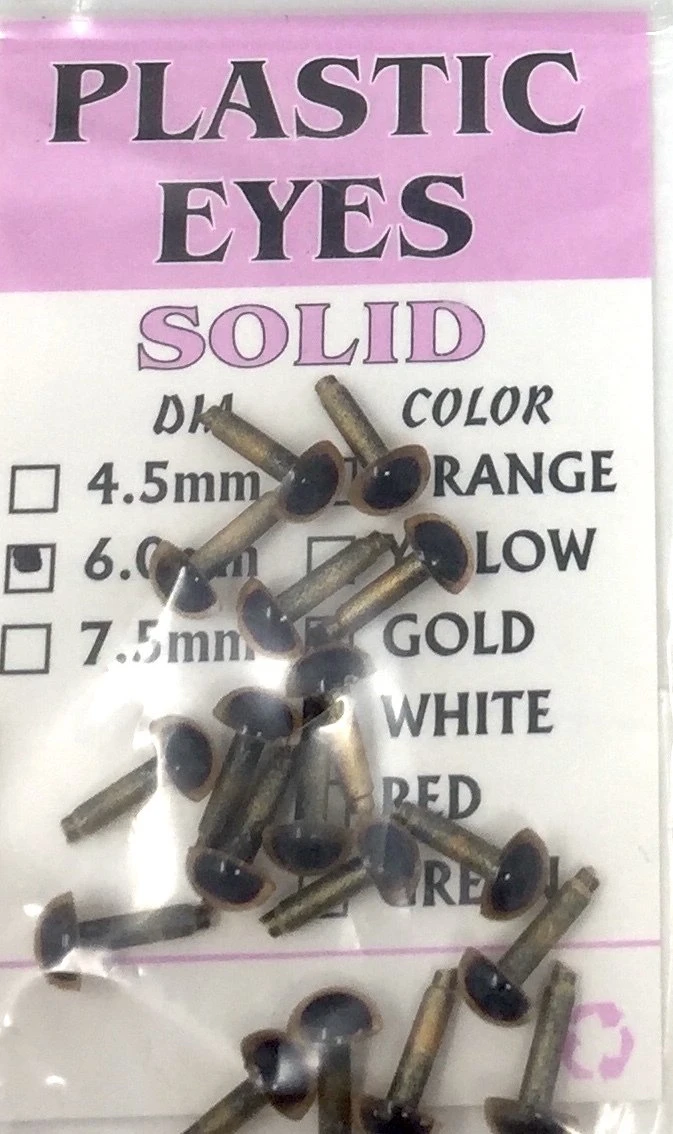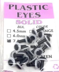 Wapsi Solid Plastic Eyes are great for poppers and baitfish patterns. Available in several sizes and colors. The stem can be cut down or off. Leave the stem on for a better holding eye in deer hair or foam.