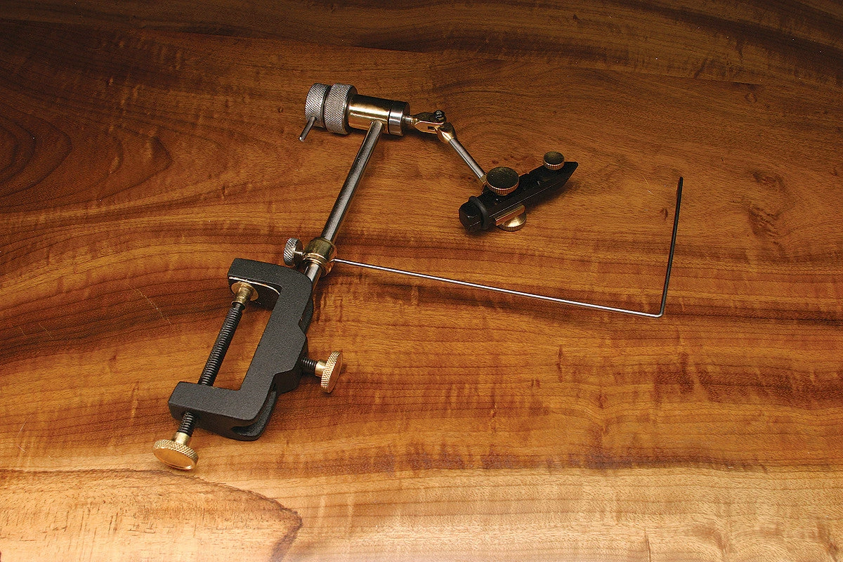 TheRotary Vise offers important features to tyers who primary focus on tying trout flies. The vise arm holding the jaws is articulated allowing up and down movement in addition to its 360-degree rotation. This is extremely helpful when tying small flies because the fly can be positioned in the most comfortable position for the tyer – allowing plenty of finger clearance while tying. The two-part jaws are fully adjustable allowing the vise to accept hooks of nearly every size. The vise also comes supplied with a handy bobbin cradle and extra-large c-clamp.